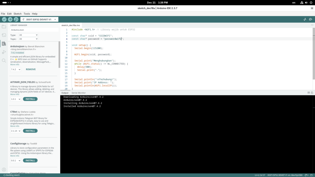 HTTPClient: Digunakan untuk membuat ESP32 bertindak seperti browser yang “mengunjungi” alamat API.http.GET(): Perintah untuk mengambil data dari server.ArduinoJson: Karena data dari internet biasanya berbentuk teks panjang yang rumit (JSON), library ini memecahnya agar kita bisa mengambil nilai tertentu saja (misalnya hanya mengambil jam “Maghrib”).