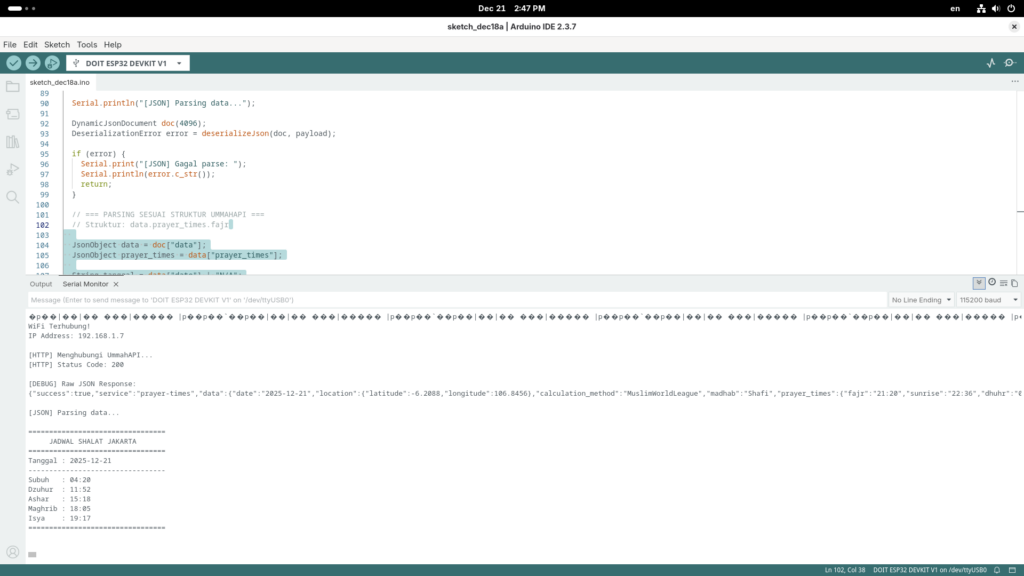 Kode ini akan menghubungi API, mengambil data waktu shalat untuk hari ini, dan menampilkannya di Serial Monitor.